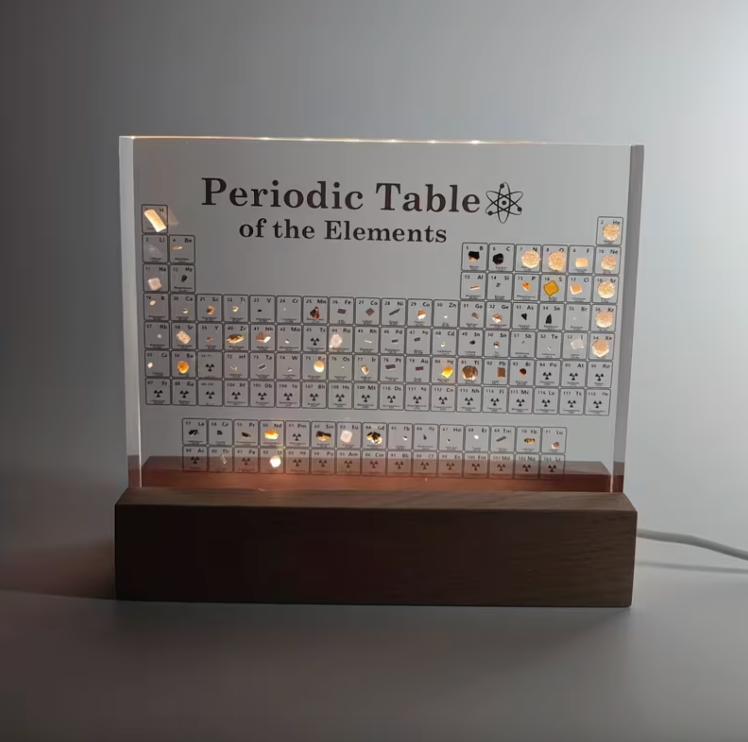 Inside this precision-crafted display sit authentic micro-samples of real elements — metals, crystals, noble gases, rare curiosities — each beautifully labeled with its symbol, atomic number, and mass. Turn it on and a warm ambient glow highlights each elemental treasure like a museum exhibit… except it’s on your desk.