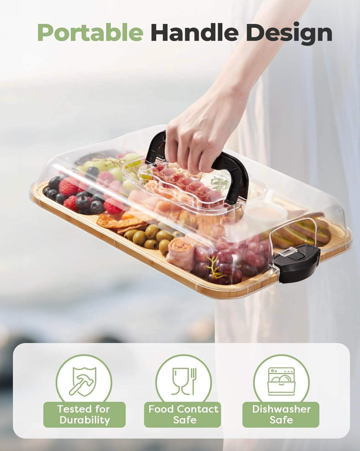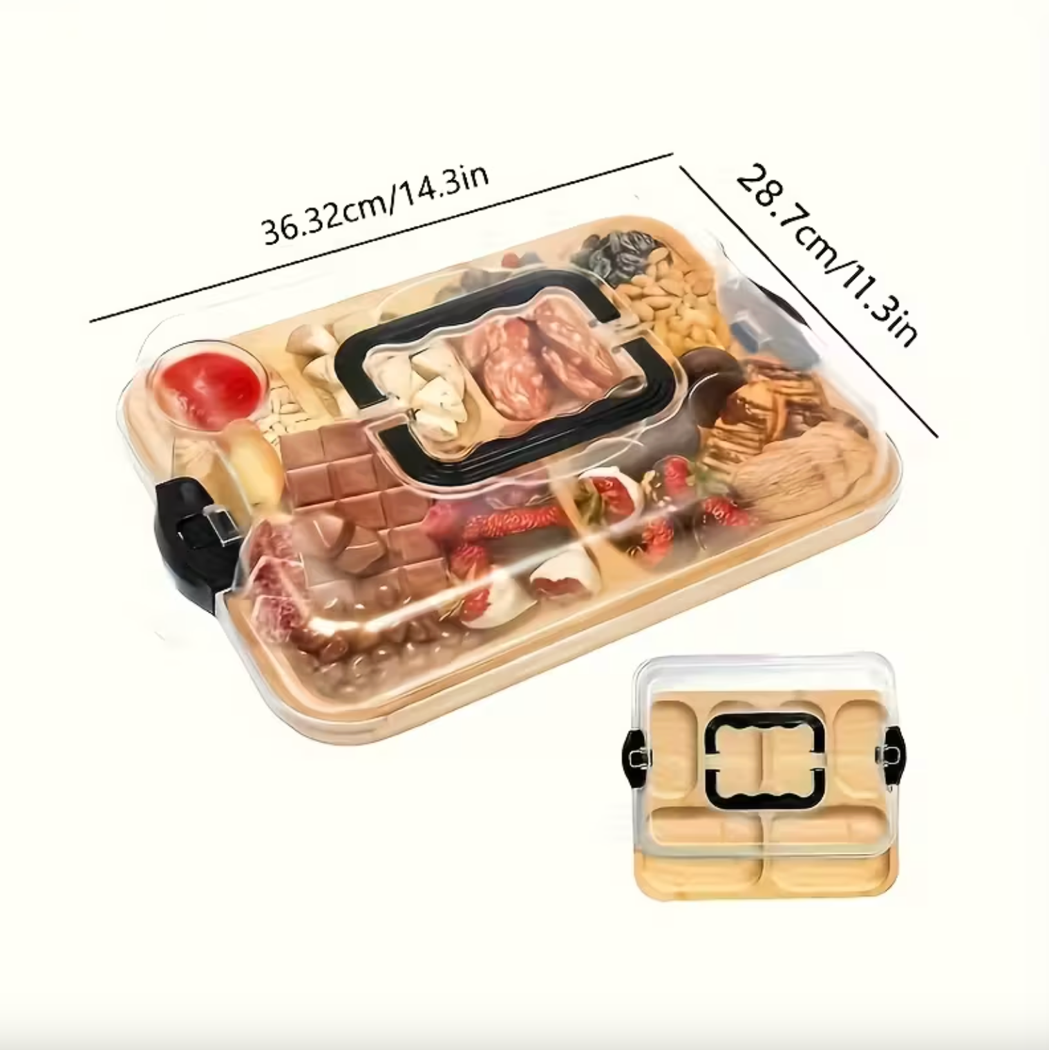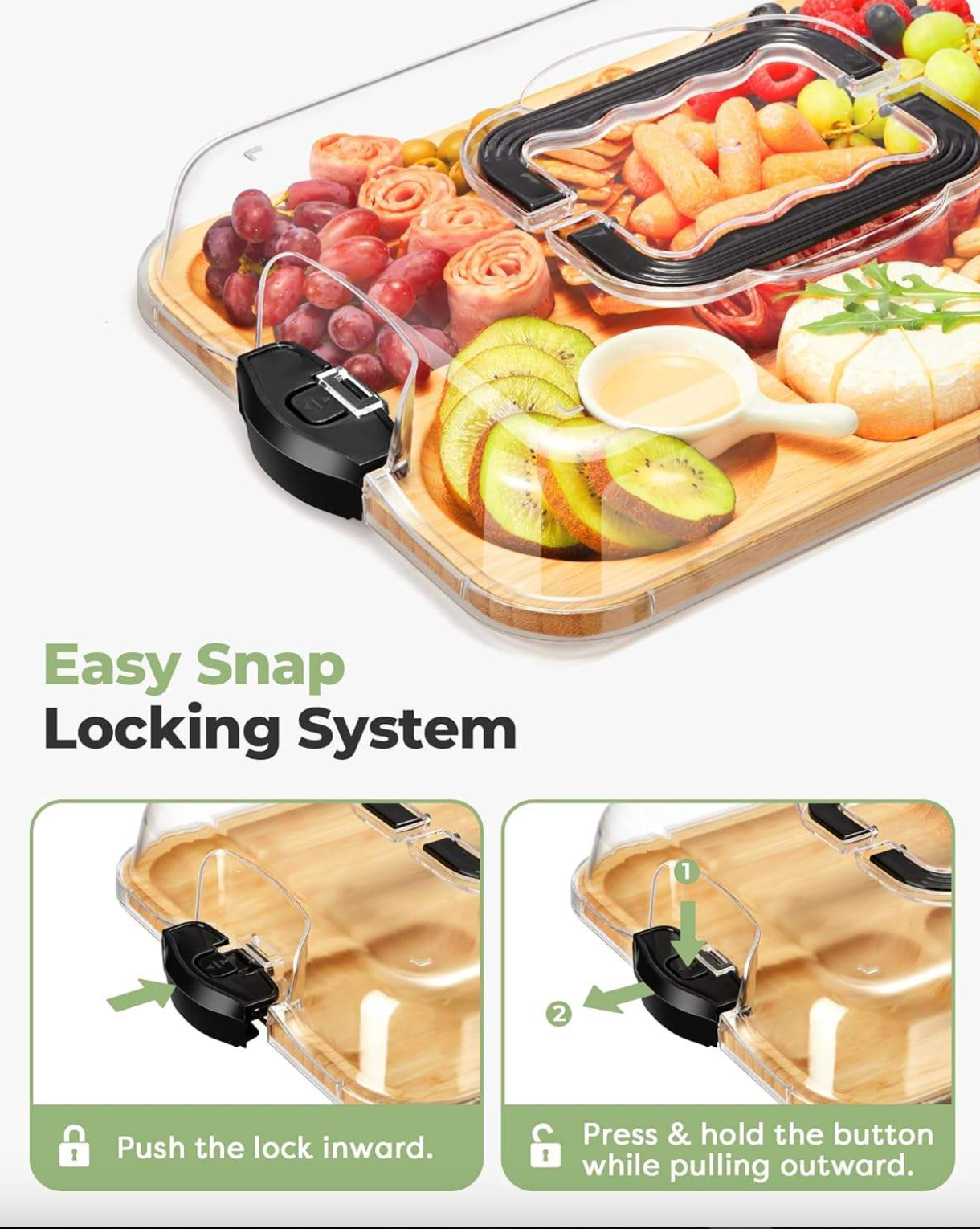 Built with convenience in mind, GatherBoard™ features an integrated carry handle and a secure transparent lid, making it easy to transport your favorite snacks without spills or stress. The four sturdy buckle locks and sealing strips keep the lid tightly connected, helping food stay fresh, protected, and neatly in place during travel.